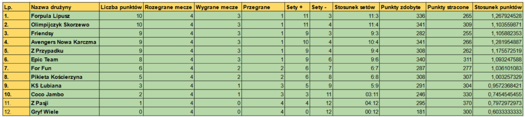 Nasza drużyna siatkarska rozegrała kolejne dwa mecze w ramach Powiatowej Amatorskiej Ligi Drużyn Mieszanych w Kościerzynie. Najpierw, 26 października, po zaciętej walce ulegliśmy ekipie Epic Team 2:3, aby w kolejnym meczu, 9 listopada, pokonać Pikietę Kościerzyna 3:0. Była to spora niespodzianka, bo Pikieta była faworytem tego meczu.